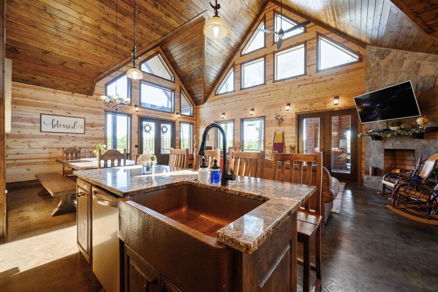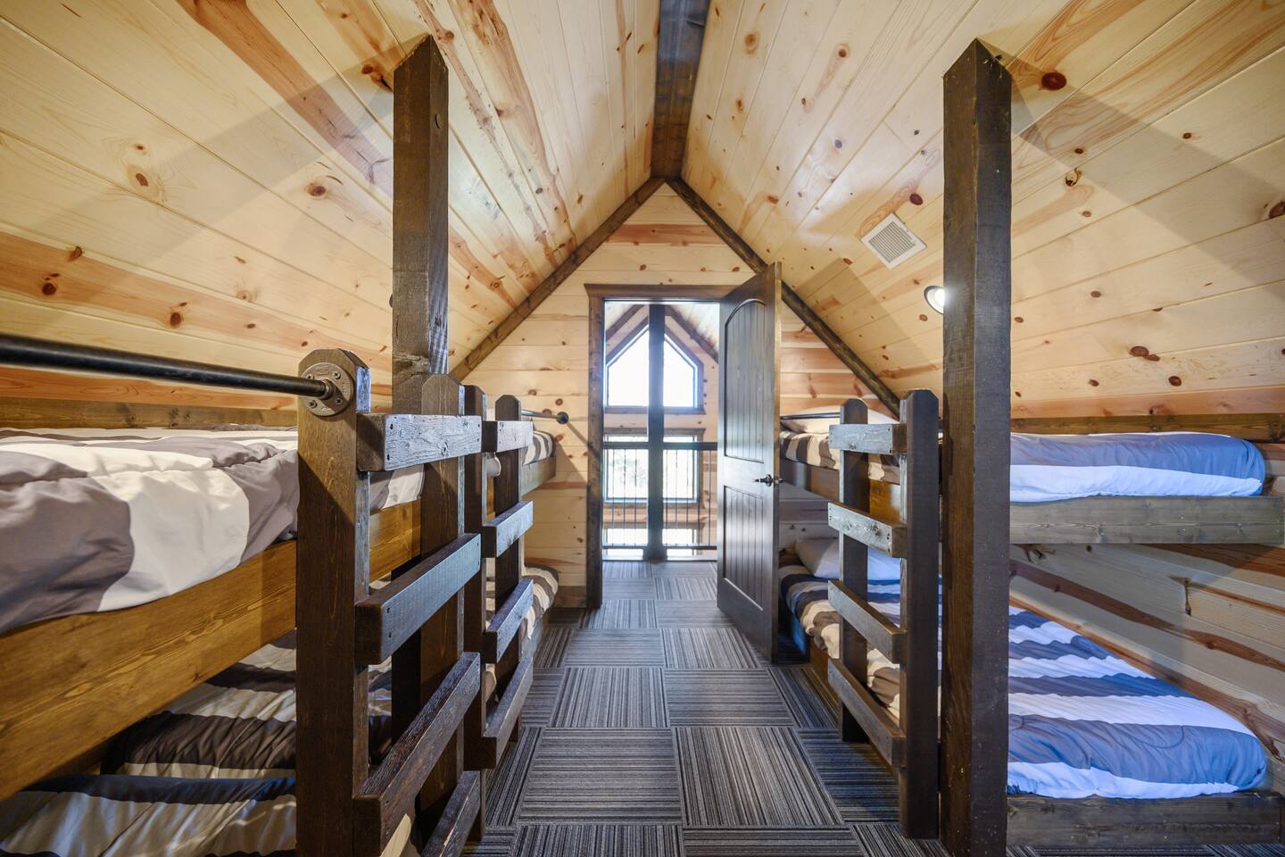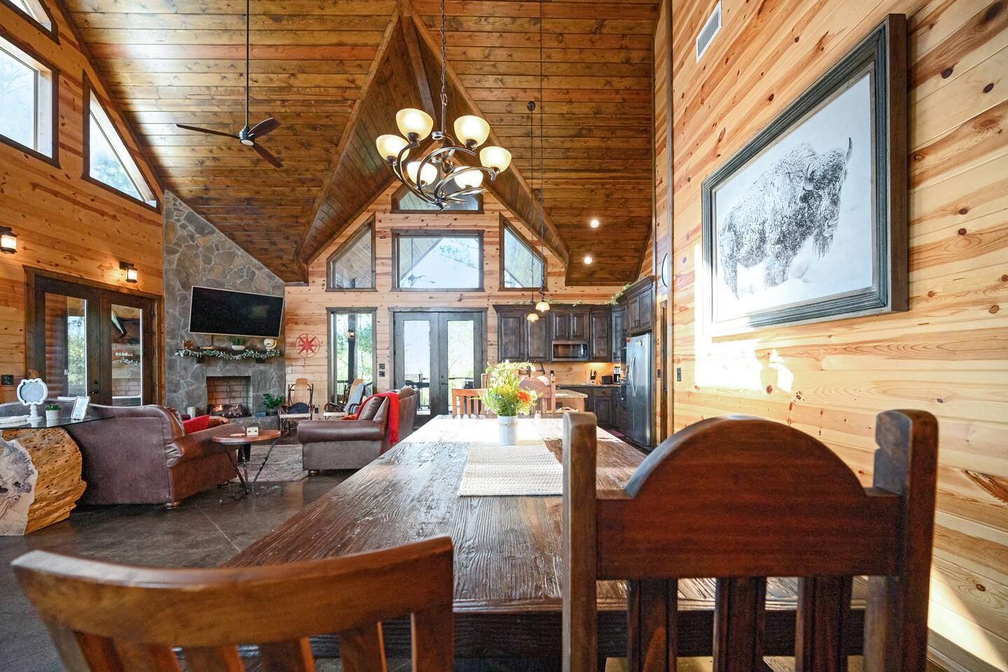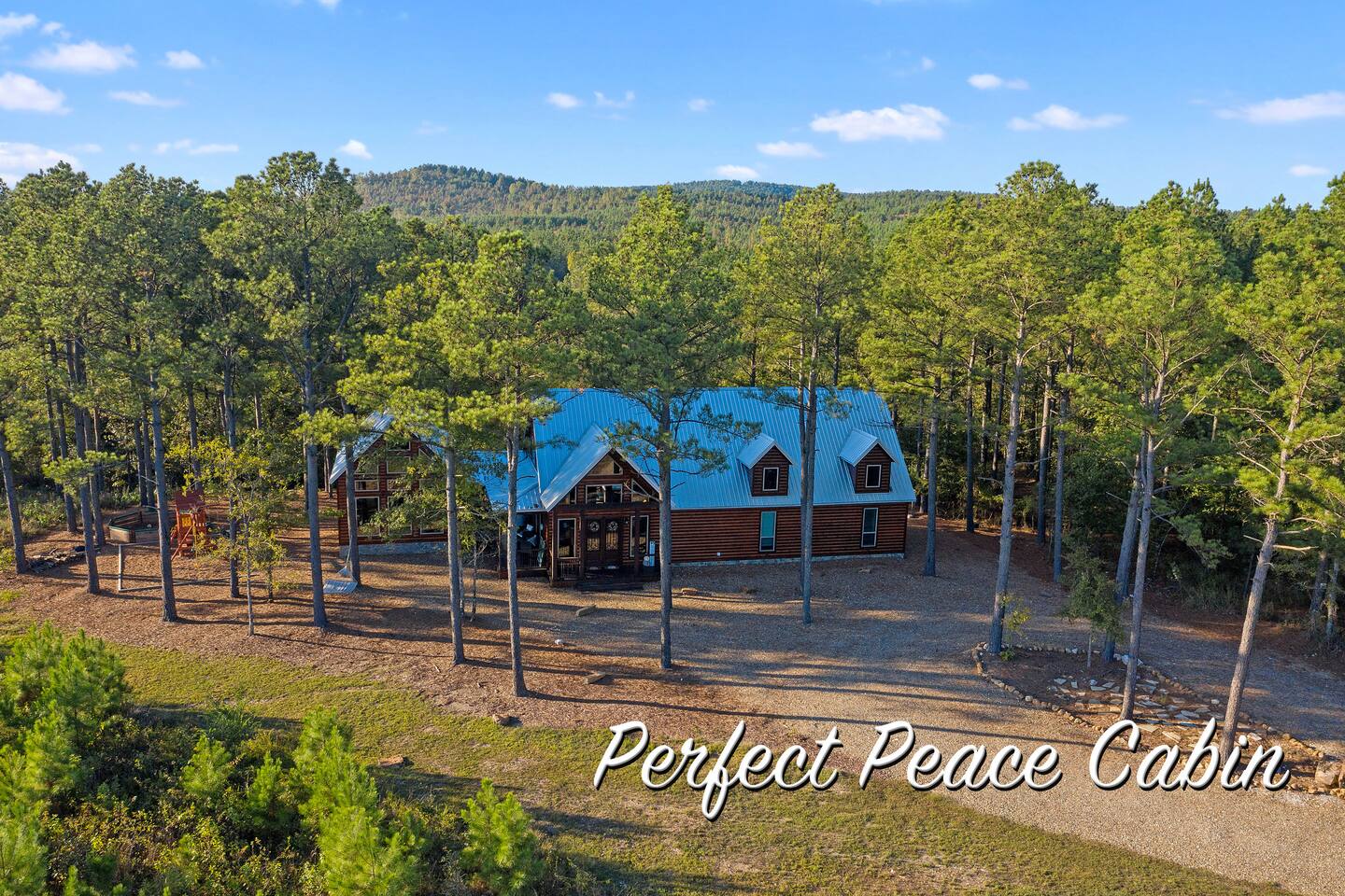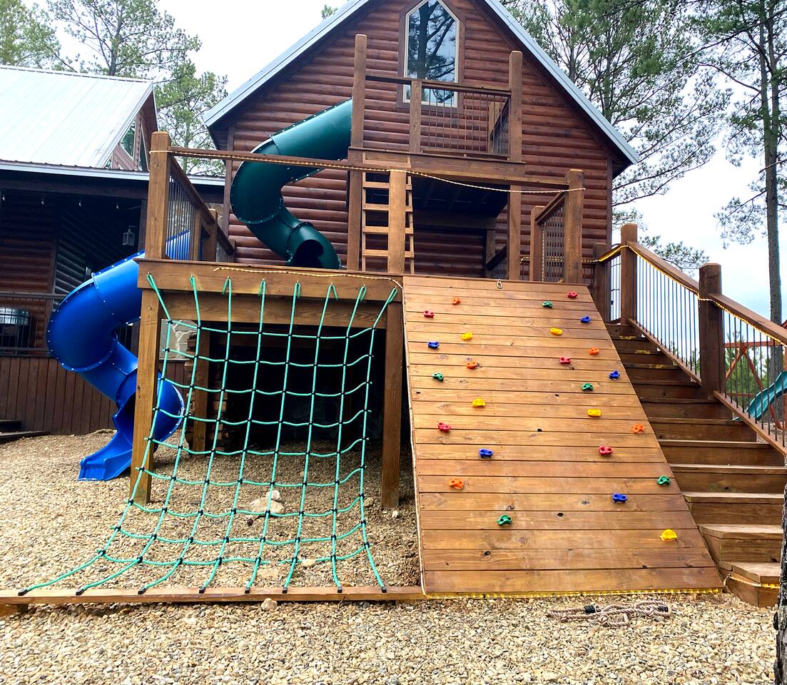 Welcome to "Perfect Peace" Luxury Cabin! Sit back and relax in this beautifully secluded cabin personalized for your comfort. While there are beds for 14 people, we do have 3 pullout sofas so you are able to sleep 20. Perfect Peace Luxury Cabin, tucked away at the end of the road for privacy, is an amazing getaway with incredible views. It has an open floor plan that allows visibility throughout the house, vaulted cathedral ceilings, huge windows that frame the spectacular views. Two fireplaces, 7 big screen TV's, 4 king master bedrooms, 5 full bathrooms, one 1/2 bath convenient to the living room, a loft room with 6 bunk beds, full size washer and dryer, and a kitchen stocked for every cook's desire. There is wireless Wi-Fi. Netflix is provided along with Dish TV. Perfect Peace Luxury Cabin was made for relaxing and visiting with family and friends. Designed with family in mind, everything you need is on one floor in the main living area. There is a ramp in the back for anyone with mobility issues. Enjoy the natural beauty of Oklahoma on the large deck, lay in the oversized hammock, or soak in the jacuzzi hot tub after a full day of activities. Perfect Peace Luxury Cabin is the perfect getaway for family or friends. The cabin has room for 14 people (20 with sleeper sofas). Each of the four king suites has its own personal TV with cable and internet, as well as, a beautiful accent wall that brings individual character to each room. To make your stay even more comfortable, each bedroom also has a gorgeous private bathroom with granite countertops and glass bowl sinks. Three of the bathrooms have tubs for cleaning the little ones in the family, along with showers. Two of the bathrooms have beautiful glass doors with oversized showers. Even the insomniacs among you will be put to sleep on the Serta luxury hybrid super-pillow top mattresses and 650 thread count Egyptian cotton sheets on each bed. The loft, located above the attached game room sleeps 6, plus extra sleeping arrangements can be made using 3 of our sleeper sofas – two located in the living room and one in the game room. Cook a gourmet dinner in the fully stocked kitchen with granite countertops, a copper farmhouse sink, state-of-the-art appliances including a double oven, electric stovetop, microwave, a "regular-drip" coffee maker, a Keurig coffee machine, cappuccino machine, waffle maker, ice cream maker, 8 quart crockpot, 3 quart crockpot, and large pantry. You can grill on either the gas or charcoal grill with all the utensils you need including an apron and skewers. After dinner, spending the evening laughing with friends and playing board games, cards, Xbox, pool, ping pong, arcade games, or shuffleboard in the game room attached to the covered deck and opened with a full garage door to bring the outside in or inside out. Kids will love our large outdoor play platform featuring two 7 ft. slides. Savor a cup of hot chocolate on the deck while overlooking the rolling hills of the Oklahoma countryside. Enjoy the beautiful Oklahoma weather with lots of outdoor furniture, a fire pit (wood included), hammock swings, a spider swing, and a swinging daybed and porch-style swing. S'mores are included in your stay. Bring your boats, hiking boots, and golf clubs as this cabin is within a few miles of Broken Lake, Beavers Bend State Park, the Cedar Creek Golf Course, and tons of great restaurants and activities like go-kart racing and the petting zoo. Perfect Peace Luxury Cabin was built for relaxation and perfectly suited for you and your family or friends. Find personalized touches throughout the house, which makes this cabin not only an immaculate place to stay but a place that will also feel like home. Sit back, relax, and take in the breathtaking view from every window. From family reunions to a weekend getaway, this cabin is perfect for anyone and everyone. Book your vacation getaway today! Amenities include: Kids Play Platform (Two 7 ft. slides) Outdoor Area featuring various swings Jacuzzi Hot Tub Fire Pit Electric car charger Wheel chair ramp located in the rear of the cabin. (Note: THE CABIN IS NOT HANDICAPPED ACCESSIBLE/EQUIPPED). The ramp is for those that have difficulty with stairs or basic mobility issues. Full size washer and dryer Childs Pack and Play (located in the laundry room above washer), toddler seat to eat, and Newborn/Toddler Tub (under the sink in bathroom 2) available.