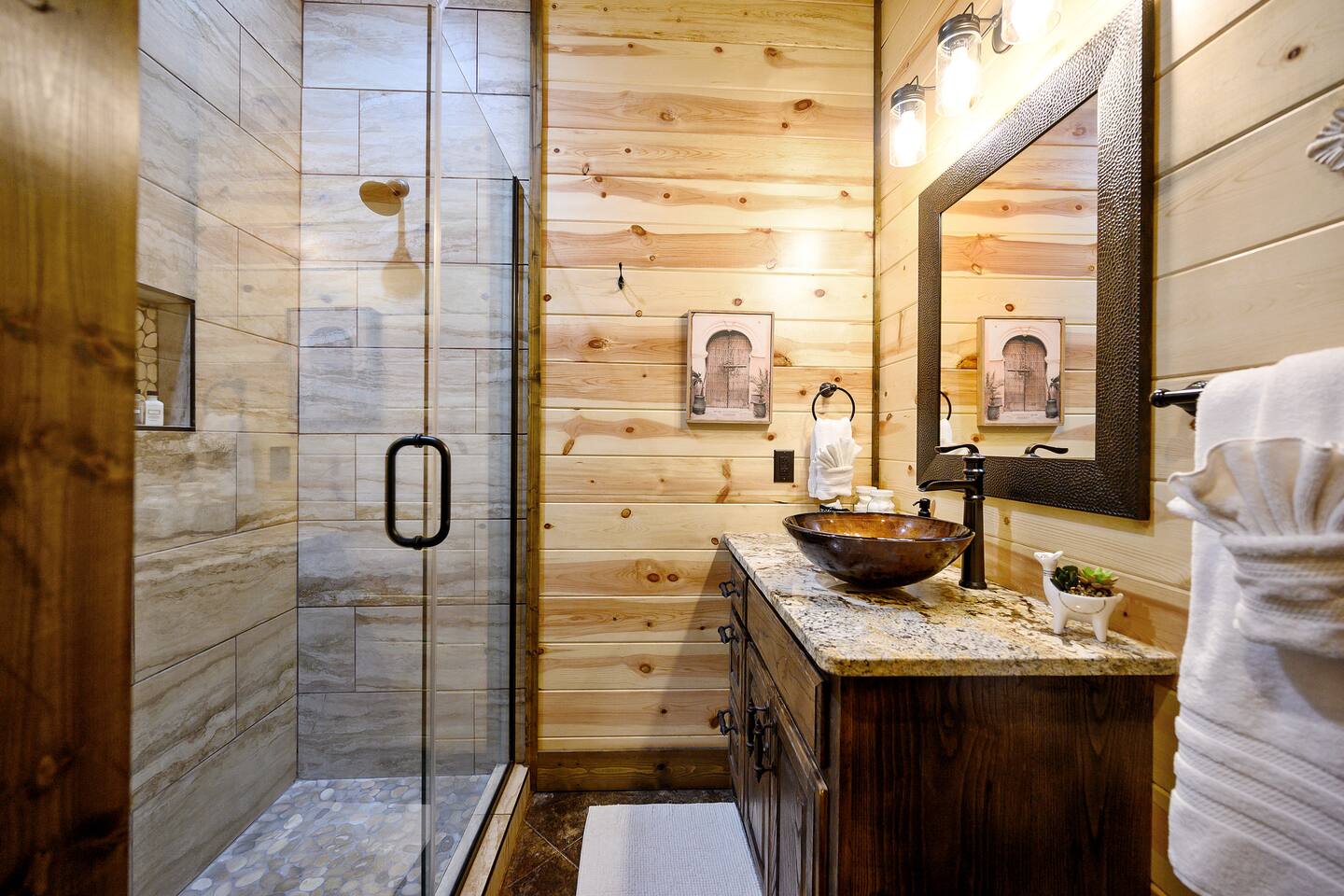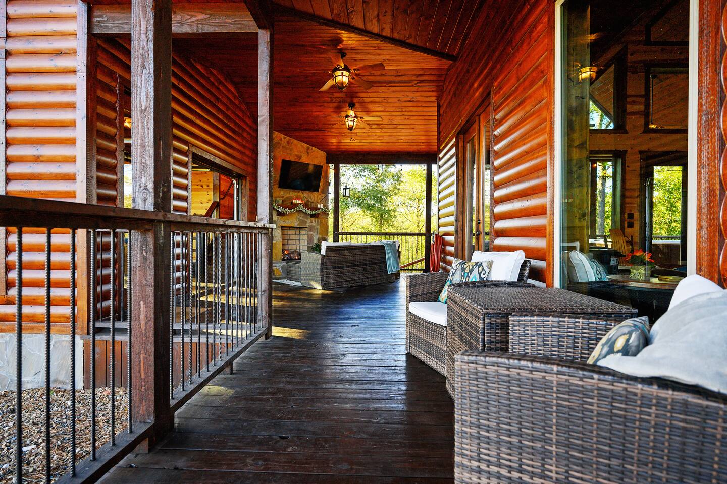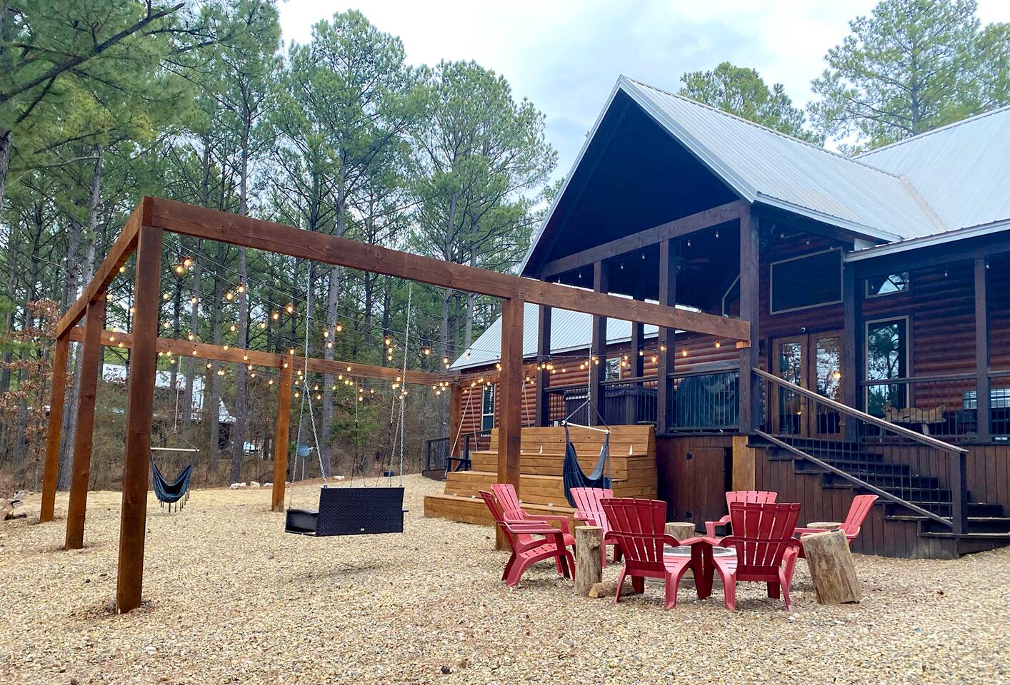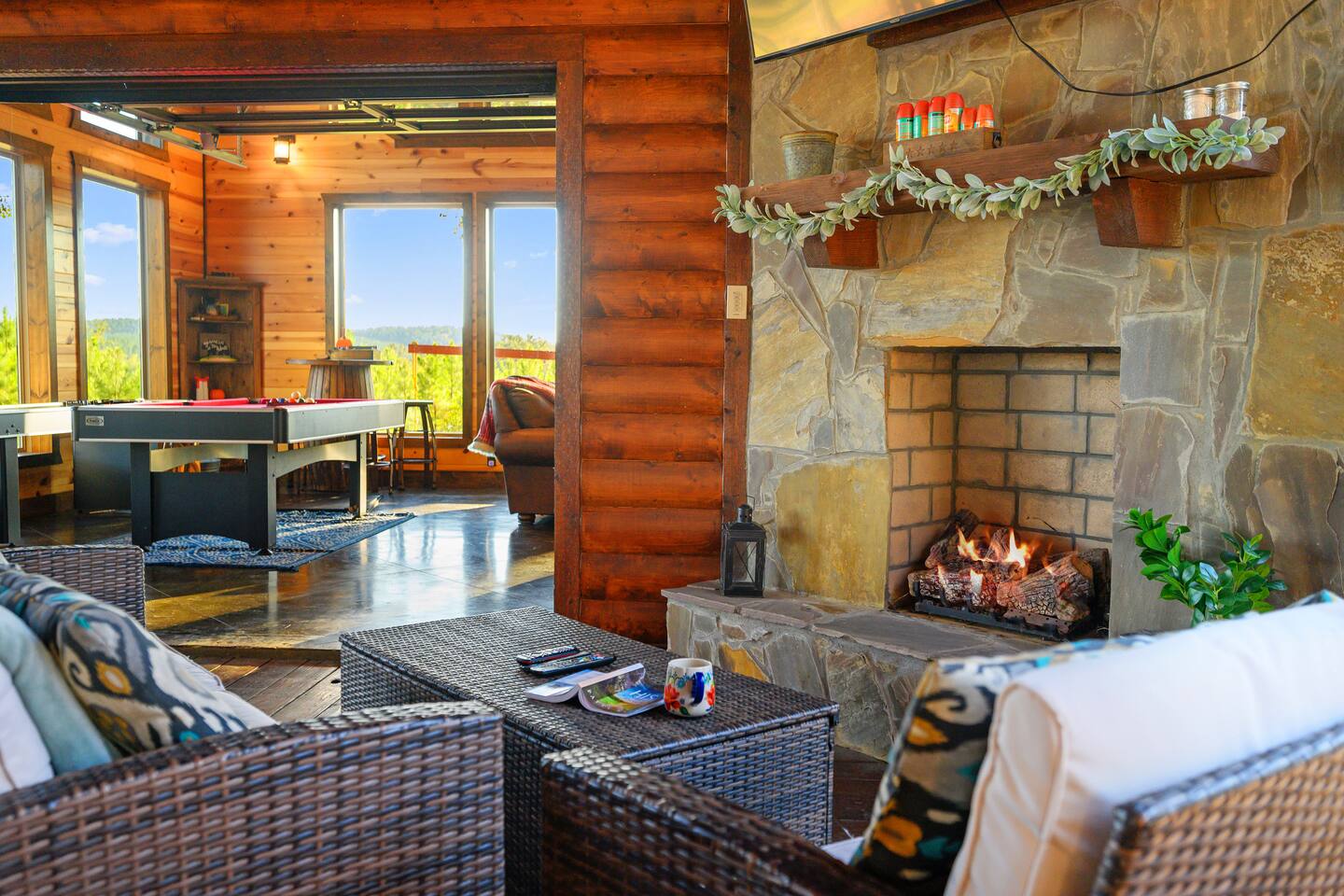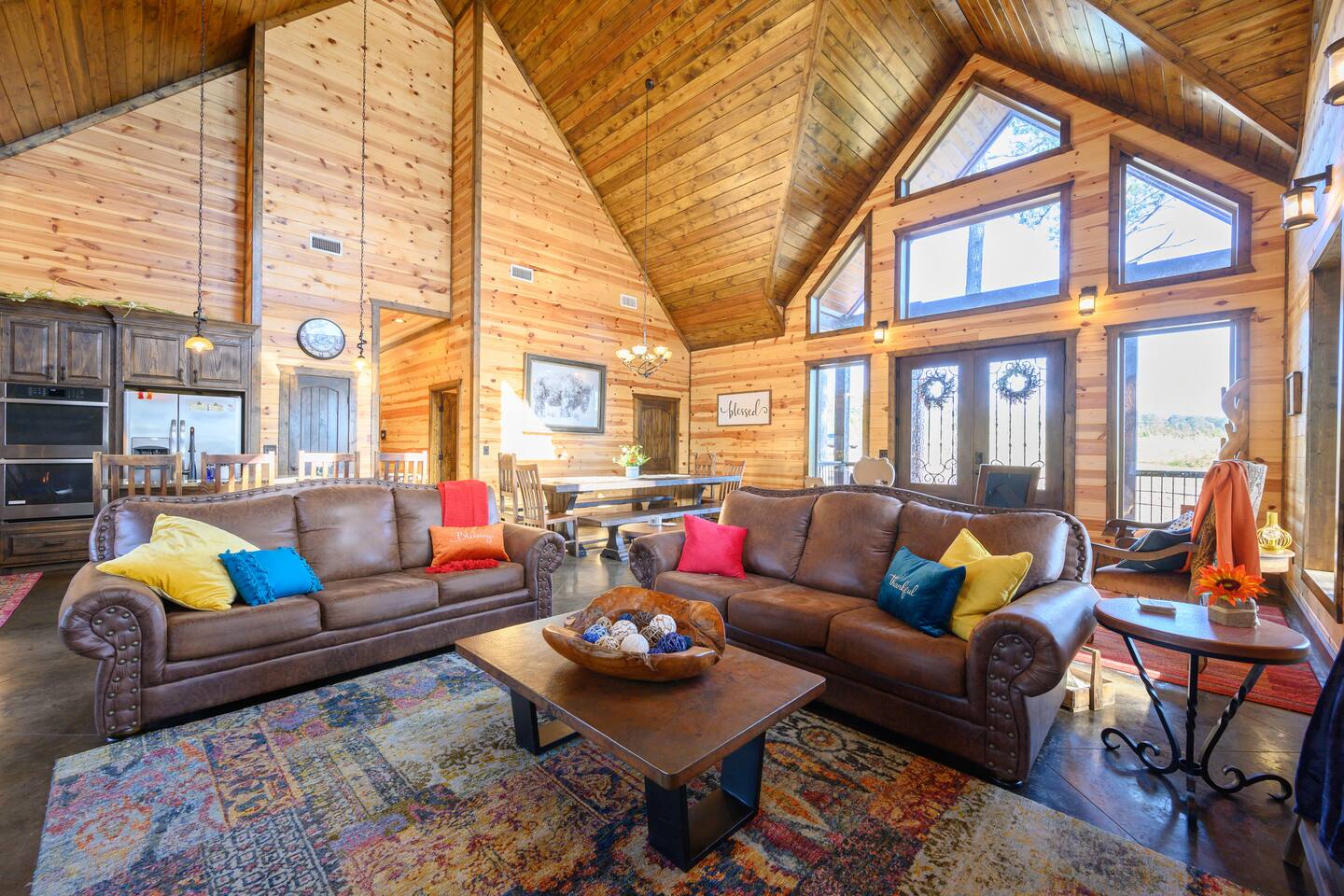 Welcome to "Perfect Peace" Luxury Cabin! Sit back and relax in this beautifully secluded cabin personalized for your comfort. While there are beds for 14 people, we do have 3 pullout sofas so you are able to sleep 20. Perfect Peace Luxury Cabin, tucked away at the end of the road for privacy, is an amazing getaway with incredible views. It has an open floor plan that allows visibility throughout the house, vaulted cathedral ceilings, huge windows that frame the spectacular views. Two fireplaces, 7 big screen TV's, 4 king master bedrooms, 5 full bathrooms, one 1/2 bath convenient to the living room, a loft room with 6 bunk beds, full size washer and dryer, and a kitchen stocked for every cook's desire. There is wireless Wi-Fi. Netflix is provided along with Dish TV. Perfect Peace Luxury Cabin was made for relaxing and visiting with family and friends. Designed with family in mind, everything you need is on one floor in the main living area. There is a ramp in the back for anyone with mobility issues. Enjoy the natural beauty of Oklahoma on the large deck, lay in the oversized hammock, or soak in the jacuzzi hot tub after a full day of activities. Perfect Peace Luxury Cabin is the perfect getaway for family or friends. The cabin has room for 14 people (20 with sleeper sofas). Each of the four king suites has its own personal TV with cable and internet, as well as, a beautiful accent wall that brings individual character to each room. To make your stay even more comfortable, each bedroom also has a gorgeous private bathroom with granite countertops and glass bowl sinks. Three of the bathrooms have tubs for cleaning the little ones in the family, along with showers. Two of the bathrooms have beautiful glass doors with oversized showers. Even the insomniacs among you will be put to sleep on the Serta luxury hybrid super-pillow top mattresses and 650 thread count Egyptian cotton sheets on each bed. The loft, located above the attached game room sleeps 6, plus extra sleeping arrangements can be made using 3 of our sleeper sofas – two located in the living room and one in the game room. Cook a gourmet dinner in the fully stocked kitchen with granite countertops, a copper farmhouse sink, state-of-the-art appliances including a double oven, electric stovetop, microwave, a "regular-drip" coffee maker, a Keurig coffee machine, cappuccino machine, waffle maker, ice cream maker, 8 quart crockpot, 3 quart crockpot, and large pantry. You can grill on either the gas or charcoal grill with all the utensils you need including an apron and skewers. After dinner, spending the evening laughing with friends and playing board games, cards, Xbox, pool, ping pong, arcade games, or shuffleboard in the game room attached to the covered deck and opened with a full garage door to bring the outside in or inside out. Kids will love our large outdoor play platform featuring two 7 ft. slides. Savor a cup of hot chocolate on the deck while overlooking the rolling hills of the Oklahoma countryside. Enjoy the beautiful Oklahoma weather with lots of outdoor furniture, a fire pit (wood included), hammock swings, a spider swing, and a swinging daybed and porch-style swing. S'mores are included in your stay. Bring your boats, hiking boots, and golf clubs as this cabin is within a few miles of Broken Lake, Beavers Bend State Park, the Cedar Creek Golf Course, and tons of great restaurants and activities like go-kart racing and the petting zoo. Perfect Peace Luxury Cabin was built for relaxation and perfectly suited for you and your family or friends. Find personalized touches throughout the house, which makes this cabin not only an immaculate place to stay but a place that will also feel like home. Sit back, relax, and take in the breathtaking view from every window. From family reunions to a weekend getaway, this cabin is perfect for anyone and everyone. Book your vacation getaway today! Amenities include: Kids Play Platform (Two 7 ft. slides) Outdoor Area featuring various swings Jacuzzi Hot Tub Fire Pit Electric car charger Wheel chair ramp located in the rear of the cabin. (Note: THE CABIN IS NOT HANDICAPPED ACCESSIBLE/EQUIPPED). The ramp is for those that have difficulty with stairs or basic mobility issues. Full size washer and dryer Childs Pack and Play (located in the laundry room above washer), toddler seat to eat, and Newborn/Toddler Tub (under the sink in bathroom 2) available.