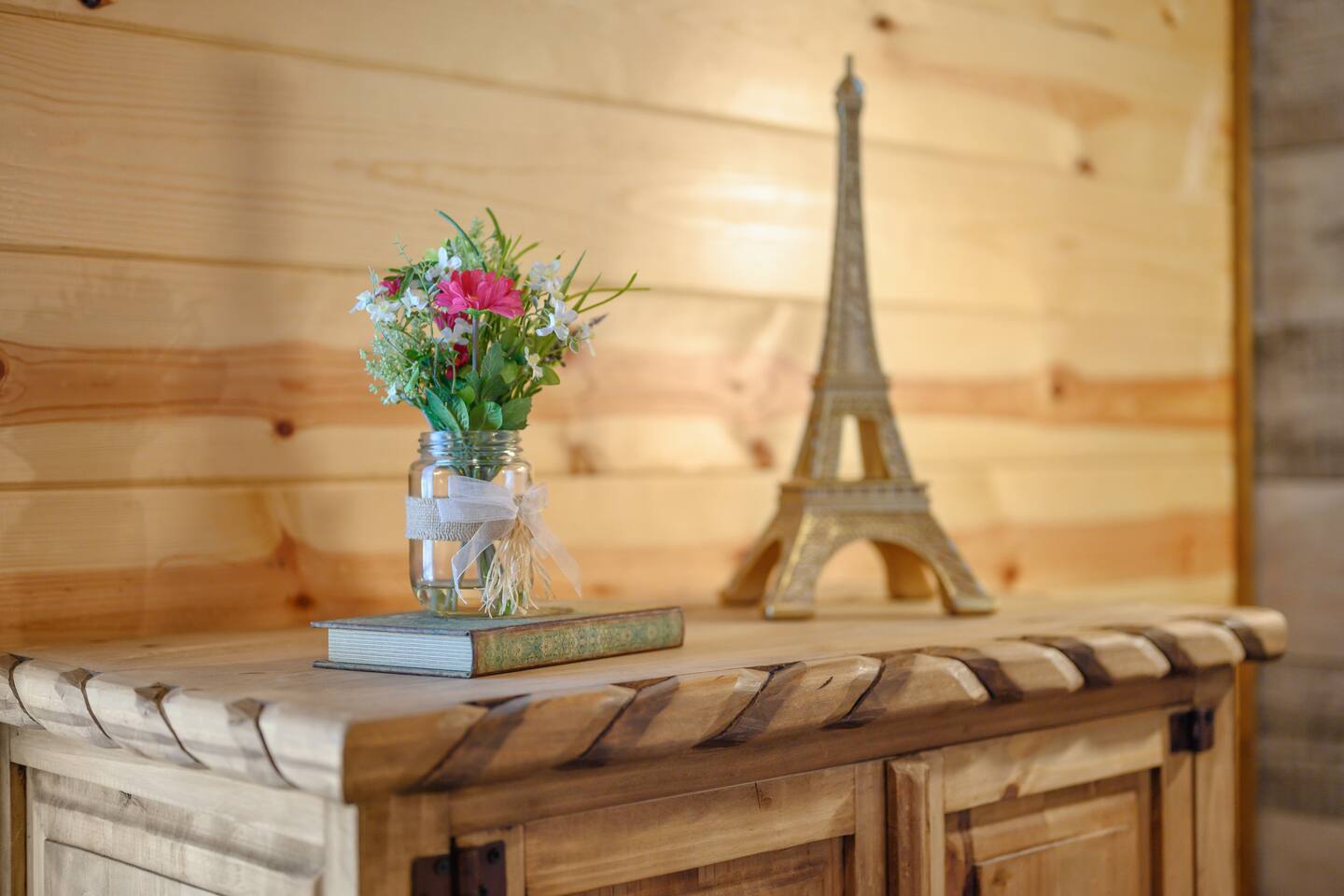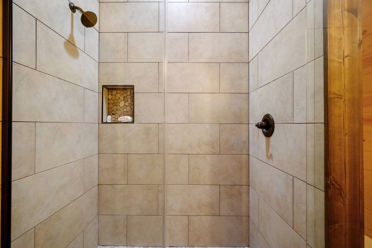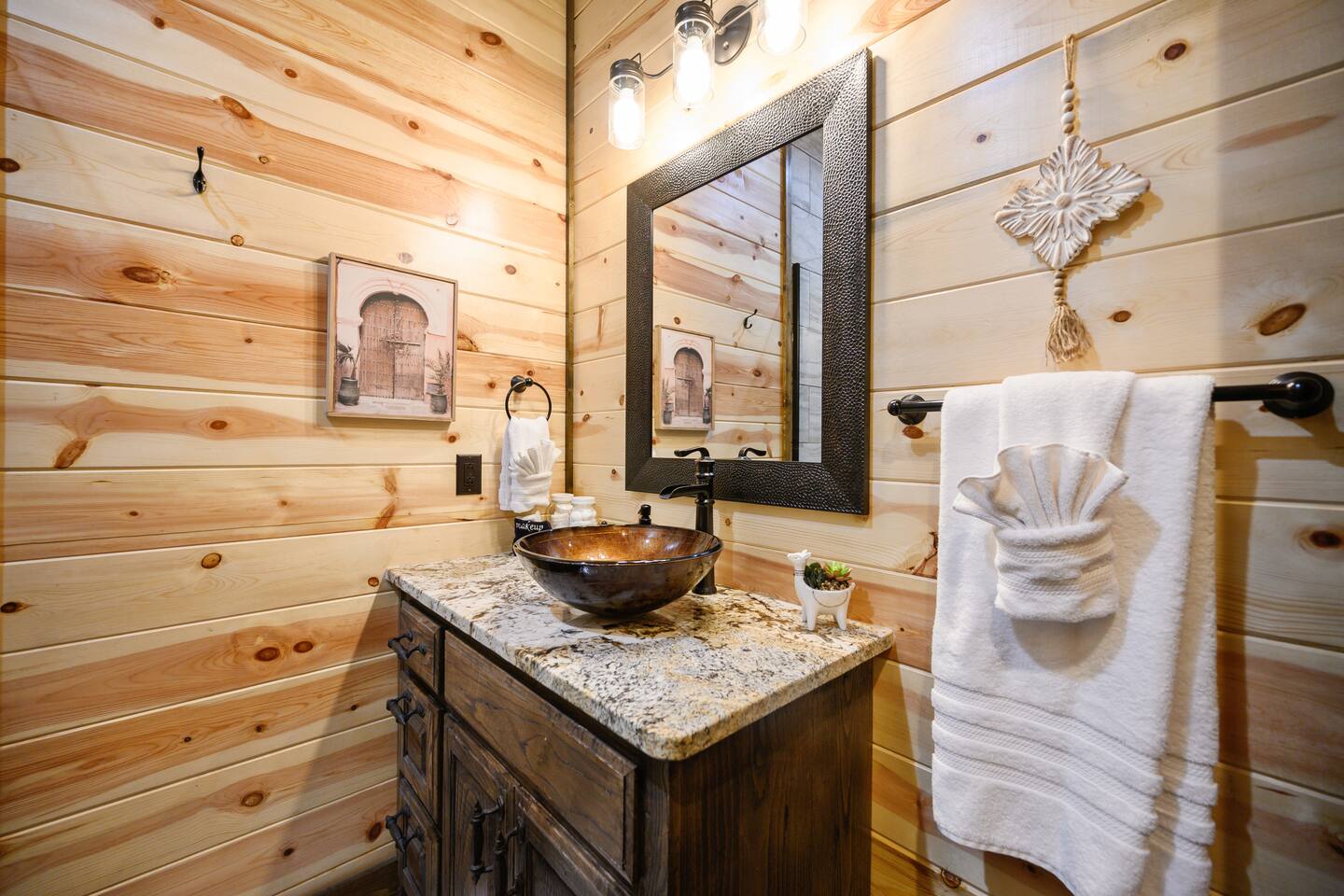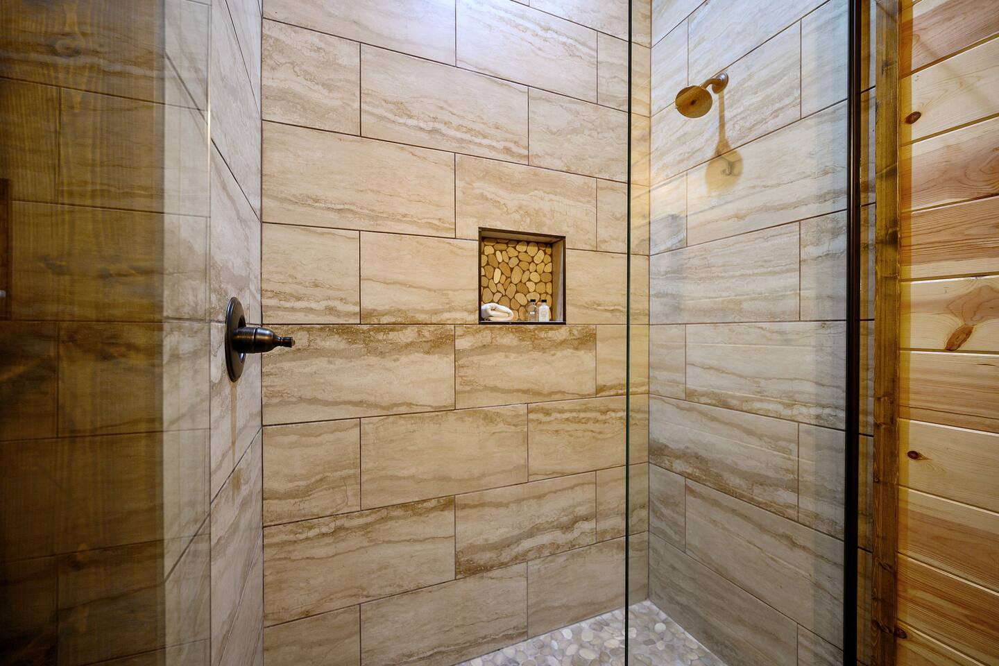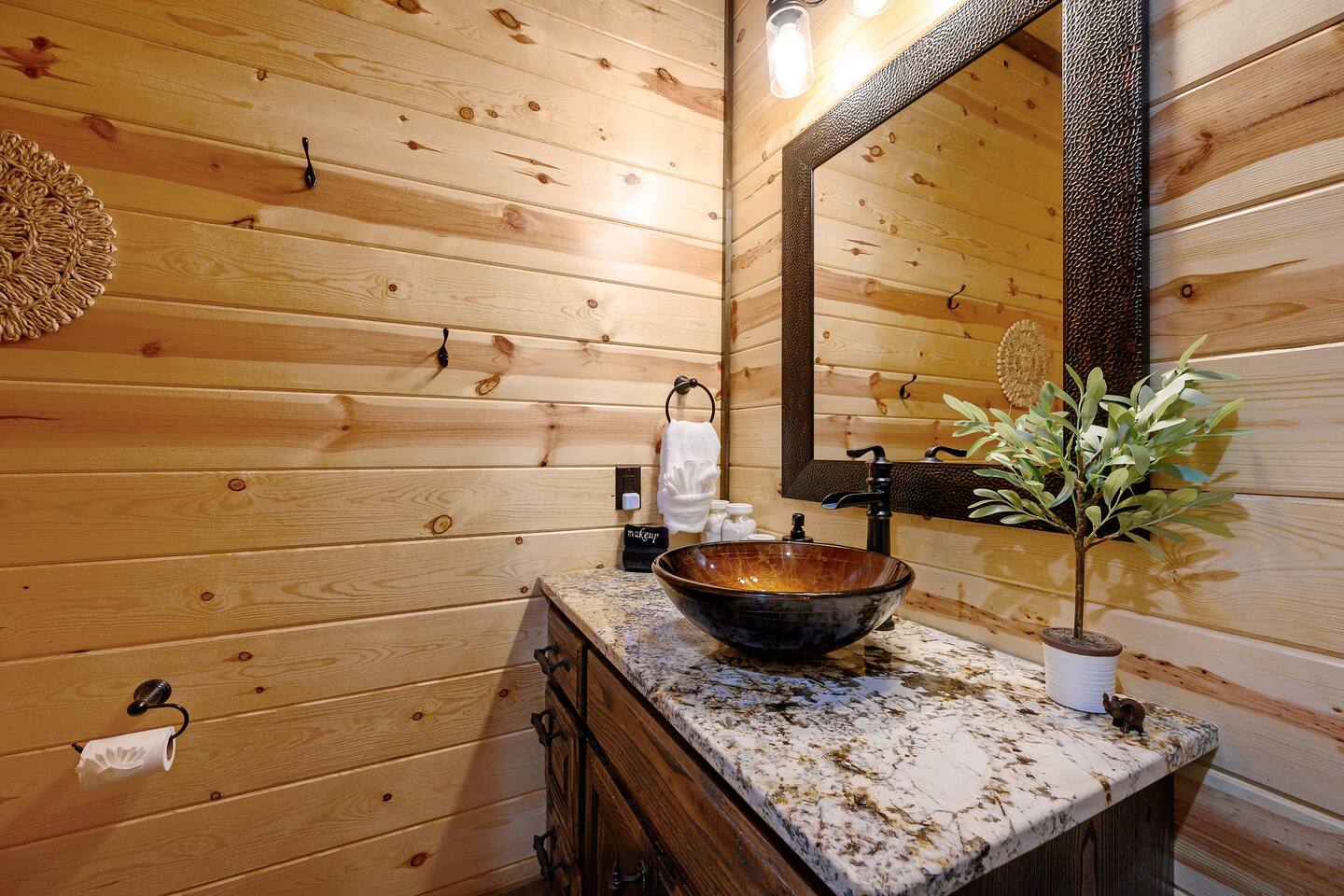 Welcome to "Perfect Peace" Luxury Cabin! Sit back and relax in this beautifully secluded cabin personalized for your comfort. While there are beds for 14 people, we do have 3 pullout sofas so you are able to sleep 20. Perfect Peace Luxury Cabin, tucked away at the end of the road for privacy, is an amazing getaway with incredible views. It has an open floor plan that allows visibility throughout the house, vaulted cathedral ceilings, huge windows that frame the spectacular views. Two fireplaces, 7 big screen TV's, 4 king master bedrooms, 5 full bathrooms, one 1/2 bath convenient to the living room, a loft room with 6 bunk beds, full size washer and dryer, and a kitchen stocked for every cook's desire. There is wireless Wi-Fi. Netflix is provided along with Dish TV. Perfect Peace Luxury Cabin was made for relaxing and visiting with family and friends. Designed with family in mind, everything you need is on one floor in the main living area. There is a ramp in the back for anyone with mobility issues. Enjoy the natural beauty of Oklahoma on the large deck, lay in the oversized hammock, or soak in the jacuzzi hot tub after a full day of activities. Perfect Peace Luxury Cabin is the perfect getaway for family or friends. The cabin has room for 14 people (20 with sleeper sofas). Each of the four king suites has its own personal TV with cable and internet, as well as, a beautiful accent wall that brings individual character to each room. To make your stay even more comfortable, each bedroom also has a gorgeous private bathroom with granite countertops and glass bowl sinks. Three of the bathrooms have tubs for cleaning the little ones in the family, along with showers. Two of the bathrooms have beautiful glass doors with oversized showers. Even the insomniacs among you will be put to sleep on the Serta luxury hybrid super-pillow top mattresses and 650 thread count Egyptian cotton sheets on each bed. The loft, located above the attached game room sleeps 6, plus extra sleeping arrangements can be made using 3 of our sleeper sofas – two located in the living room and one in the game room. Cook a gourmet dinner in the fully stocked kitchen with granite countertops, a copper farmhouse sink, state-of-the-art appliances including a double oven, electric stovetop, microwave, a "regular-drip" coffee maker, a Keurig coffee machine, cappuccino machine, waffle maker, ice cream maker, 8 quart crockpot, 3 quart crockpot, and large pantry. You can grill on either the gas or charcoal grill with all the utensils you need including an apron and skewers. After dinner, spending the evening laughing with friends and playing board games, cards, Xbox, pool, ping pong, arcade games, or shuffleboard in the game room attached to the covered deck and opened with a full garage door to bring the outside in or inside out. Kids will love our large outdoor play platform featuring two 7 ft. slides. Savor a cup of hot chocolate on the deck while overlooking the rolling hills of the Oklahoma countryside. Enjoy the beautiful Oklahoma weather with lots of outdoor furniture, a fire pit (wood included), hammock swings, a spider swing, and a swinging daybed and porch-style swing. S'mores are included in your stay. Bring your boats, hiking boots, and golf clubs as this cabin is within a few miles of Broken Lake, Beavers Bend State Park, the Cedar Creek Golf Course, and tons of great restaurants and activities like go-kart racing and the petting zoo. Perfect Peace Luxury Cabin was built for relaxation and perfectly suited for you and your family or friends. Find personalized touches throughout the house, which makes this cabin not only an immaculate place to stay but a place that will also feel like home. Sit back, relax, and take in the breathtaking view from every window. From family reunions to a weekend getaway, this cabin is perfect for anyone and everyone. Book your vacation getaway today! Amenities include: Kids Play Platform (Two 7 ft. slides) Outdoor Area featuring various swings Jacuzzi Hot Tub Fire Pit Electric car charger Wheel chair ramp located in the rear of the cabin. (Note: THE CABIN IS NOT HANDICAPPED ACCESSIBLE/EQUIPPED). The ramp is for those that have difficulty with stairs or basic mobility issues. Full size washer and dryer Childs Pack and Play (located in the laundry room above washer), toddler seat to eat, and Newborn/Toddler Tub (under the sink in bathroom 2) available.