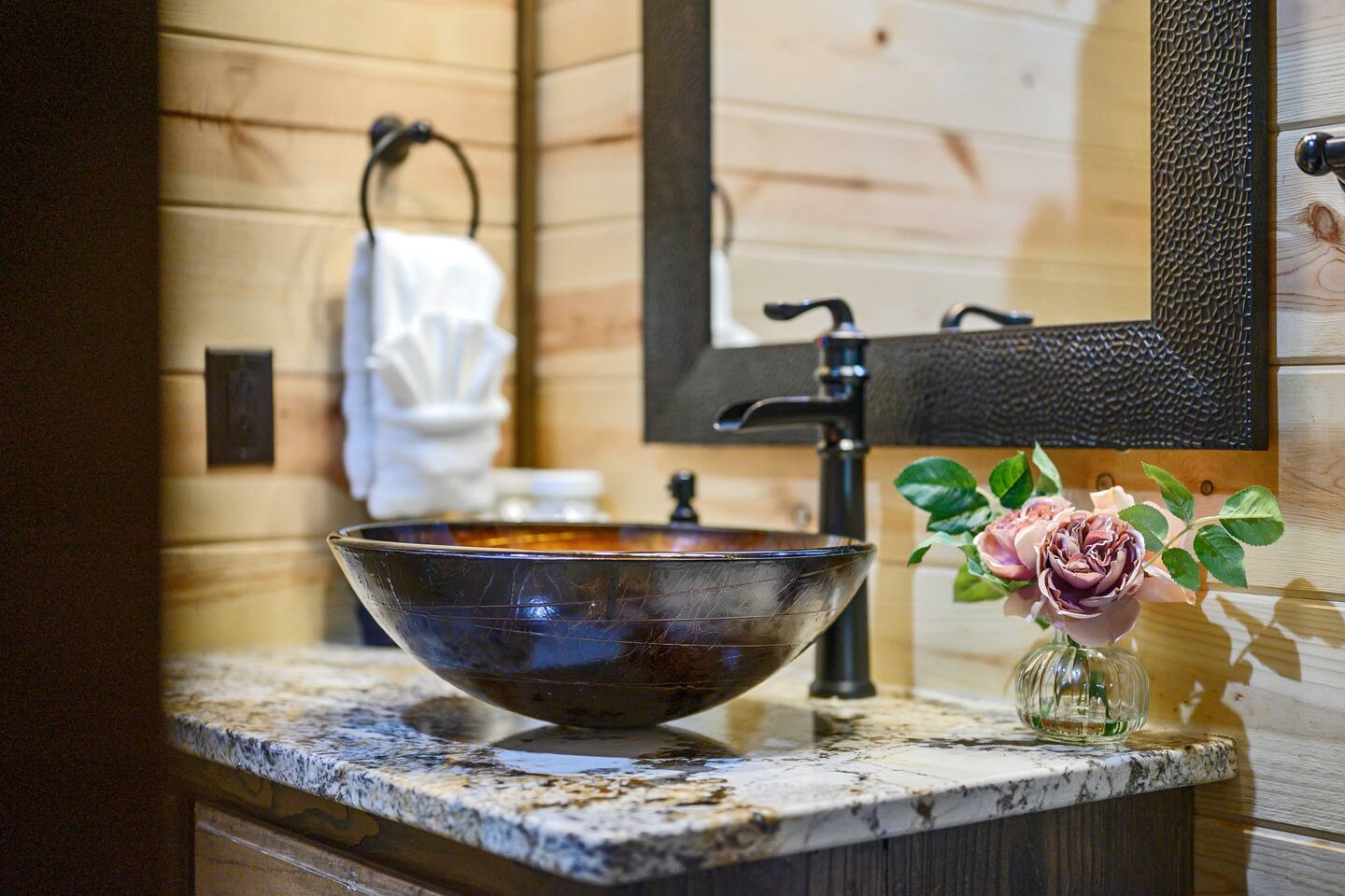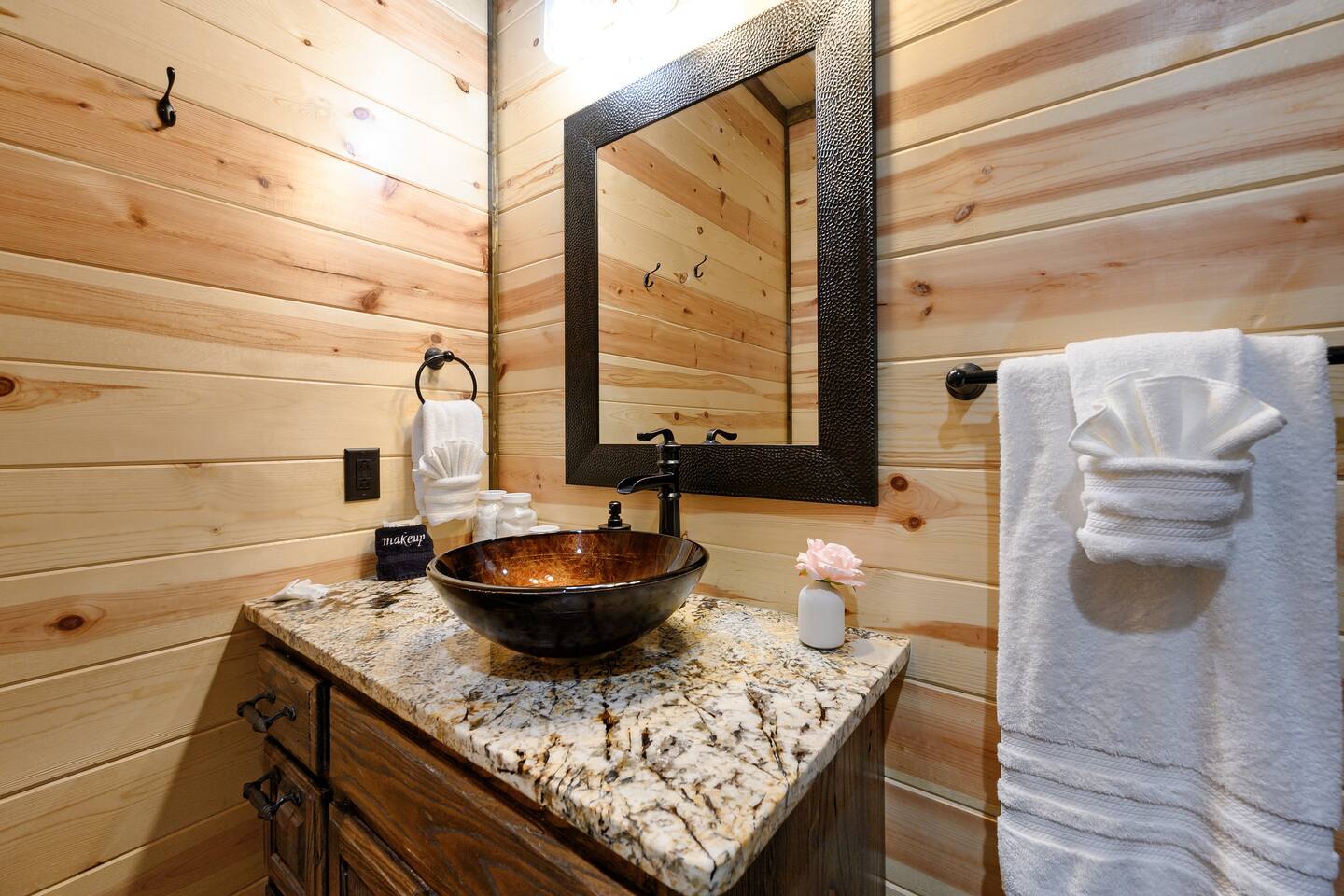 The Perfect Peace Luxury Cabin is gorgeous and relaxing with plenty of space for the getaway of a lifetime with your family or friends – incredible views, and tucked away with lots of privacy. Enjoy relaxing in the family room with its cathedral ceilings and large picturesque windows, or head outside for smores at the fire pit. Send the kids to the detached game/bunkhouse while you enjoy coffee on the deck by the fireplace or a dip in the hot tub. So much to do that you won't want to leave!
